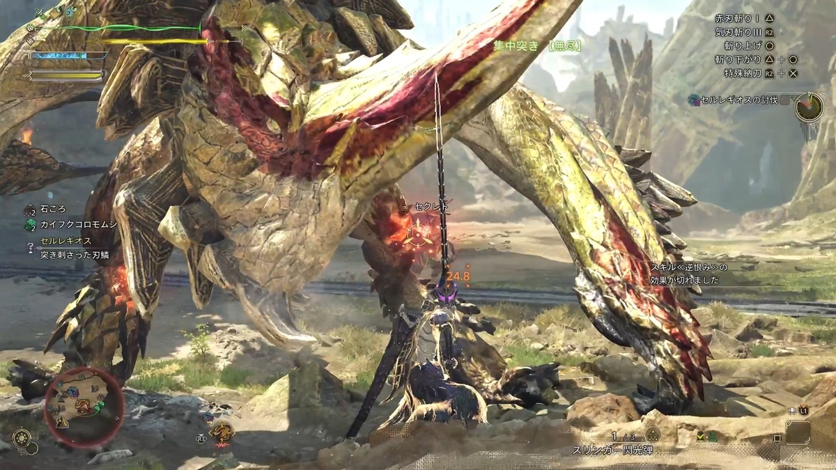 - 初動の赤ゲージ回収までは固定のモーションなので、再現性高くできるように手順を習得しよう。項番5で、見切り切りを2回行うよう書いているが、これをしないと、赤ゲージになった直後にセルレギオスの攻撃を受けてしまうため、必ず2回見切り切りを実施してからR2を押そう。